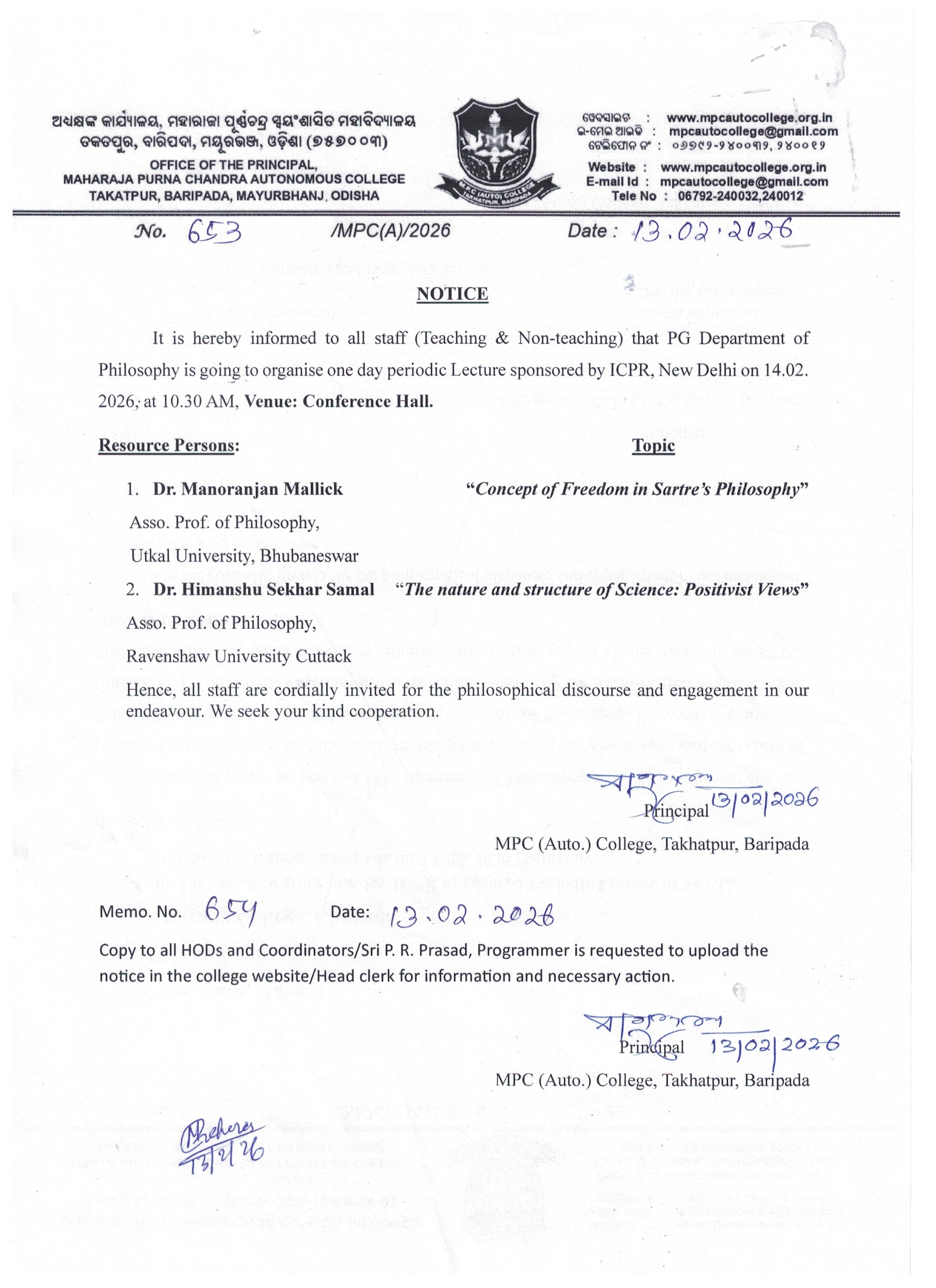 13/02/2026 : Periodic Lecture sponsored by ICPR, New Delhi Date-14.02.2026 10:30 AM